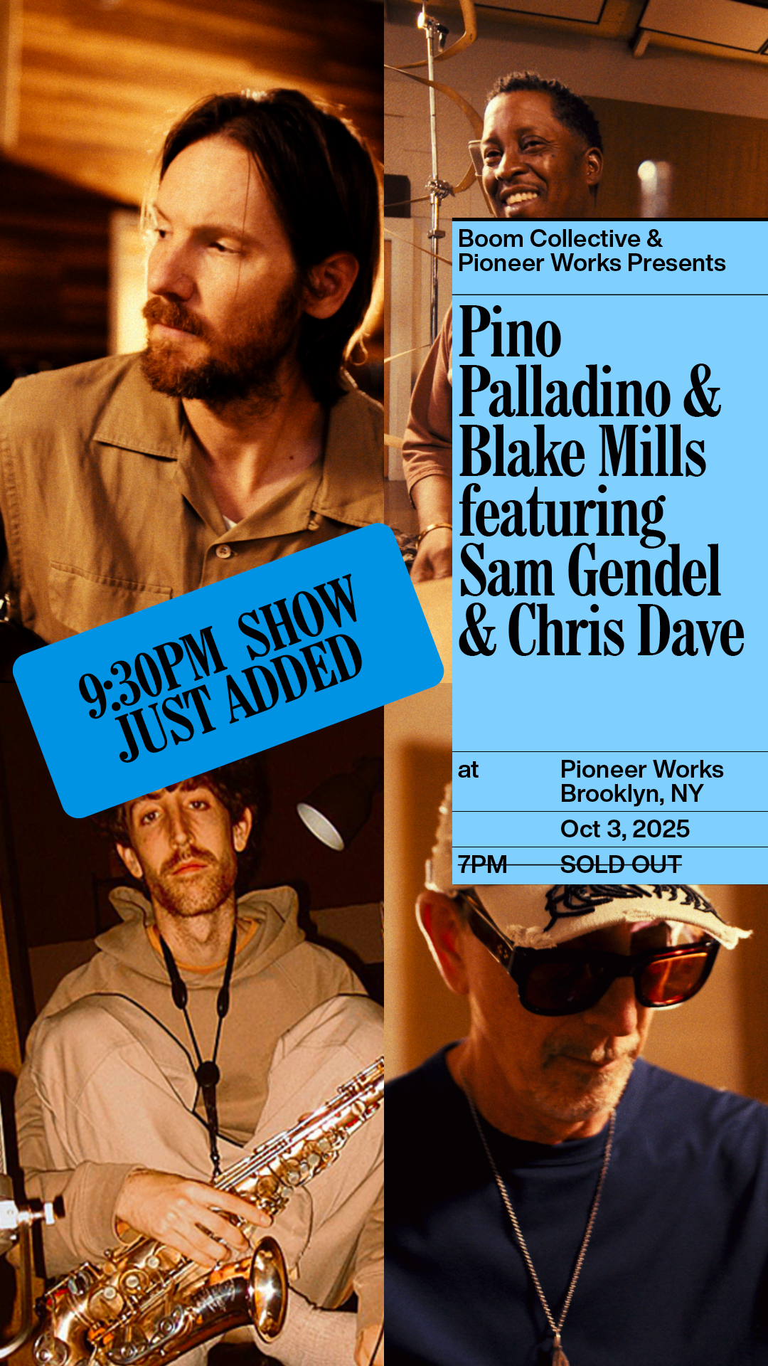 Pioneer Works is thrilled to team up with Boom Collective to present 2 sets (7 PM & 9:30 PM) by Pino Palladino & Blake Mills featuring Sam Gendel & Chris Dave to the Main Hall on October 3, 2025. Grammy-winning musicians and producers Pino Palladino & Blake Mills reunite on the heels of their album-length, instrumental collaboration, Notes With Attachments.
